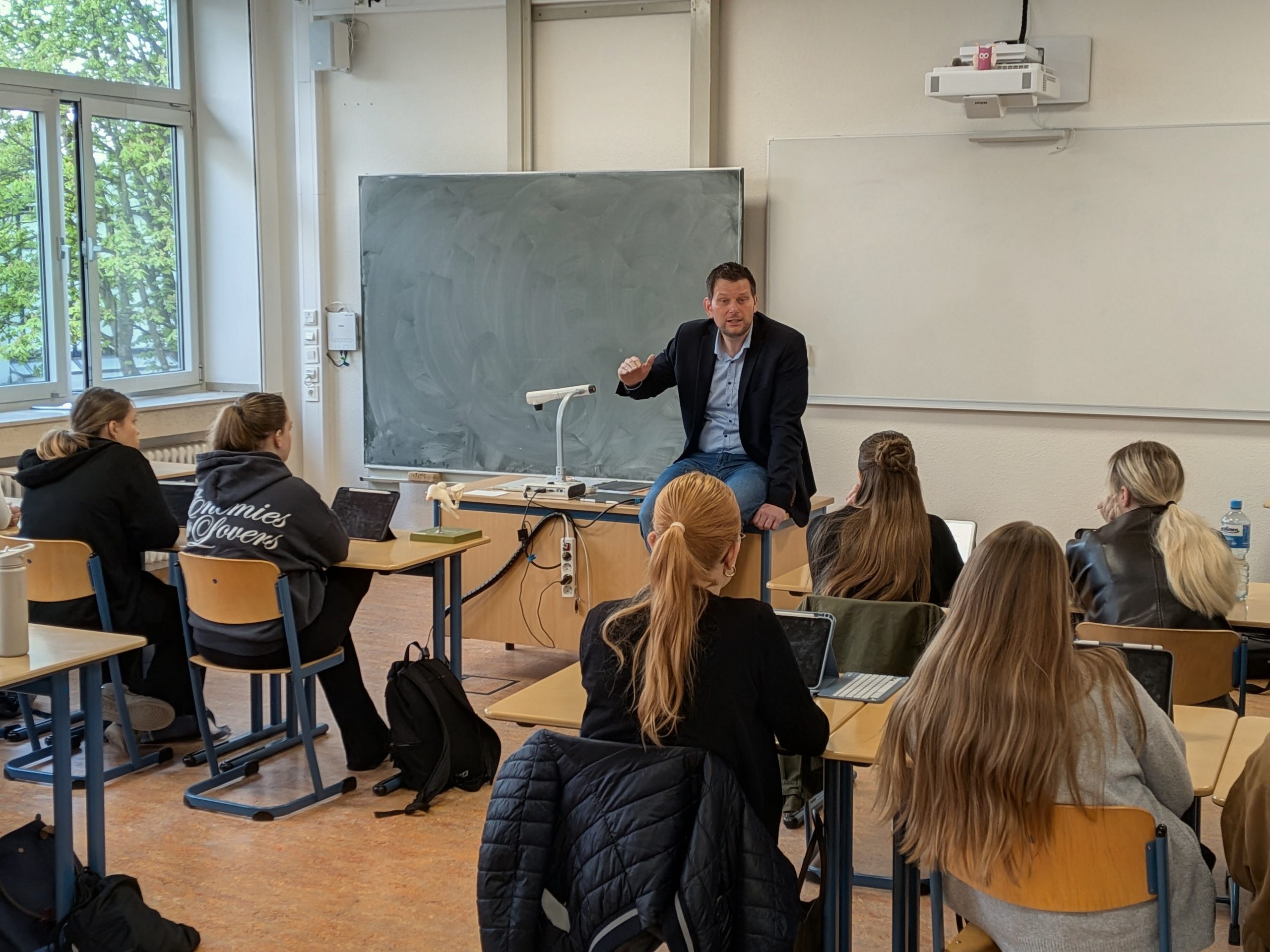 Der Landtagsabgeordnete Thorsten Klute (SPD) kam mit den Schülerinnen und Schülern ins Gespräch und diskutierte mit ihnen über Zu-kunftsaussichten im Gesundheitswesen, den Einfluss von Künstlicher Intelligenz sowie aktuelle gesundheitspolitische Herausforderungen.